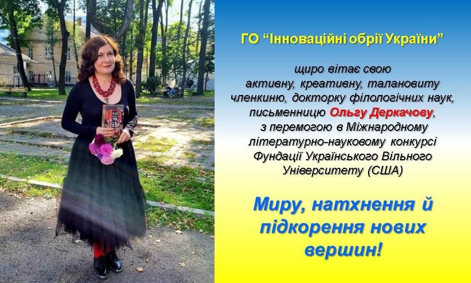 - докторка філологічних наук, письменниця, членкиня ГО «Інноваційні обрії України» Ольга ДЕРКАЧОВА стала переможницею літературно-наукового конкурсу імені Воляників-Швабінських Фундації Українського Вільного Університету (США) за збірку оповідань «Пальто британської королеви»;