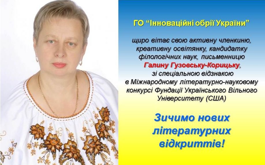 - кандидатка філологічних наук, письменниця, членкиня ГО «Інноваційні обрії України» отримала відзнаку на літературно-науковому конкурсі імені Воляників-Швабінських Фундації Українського Вільного Університету (США) за повість для дітей «На сьомому небі від щастя».