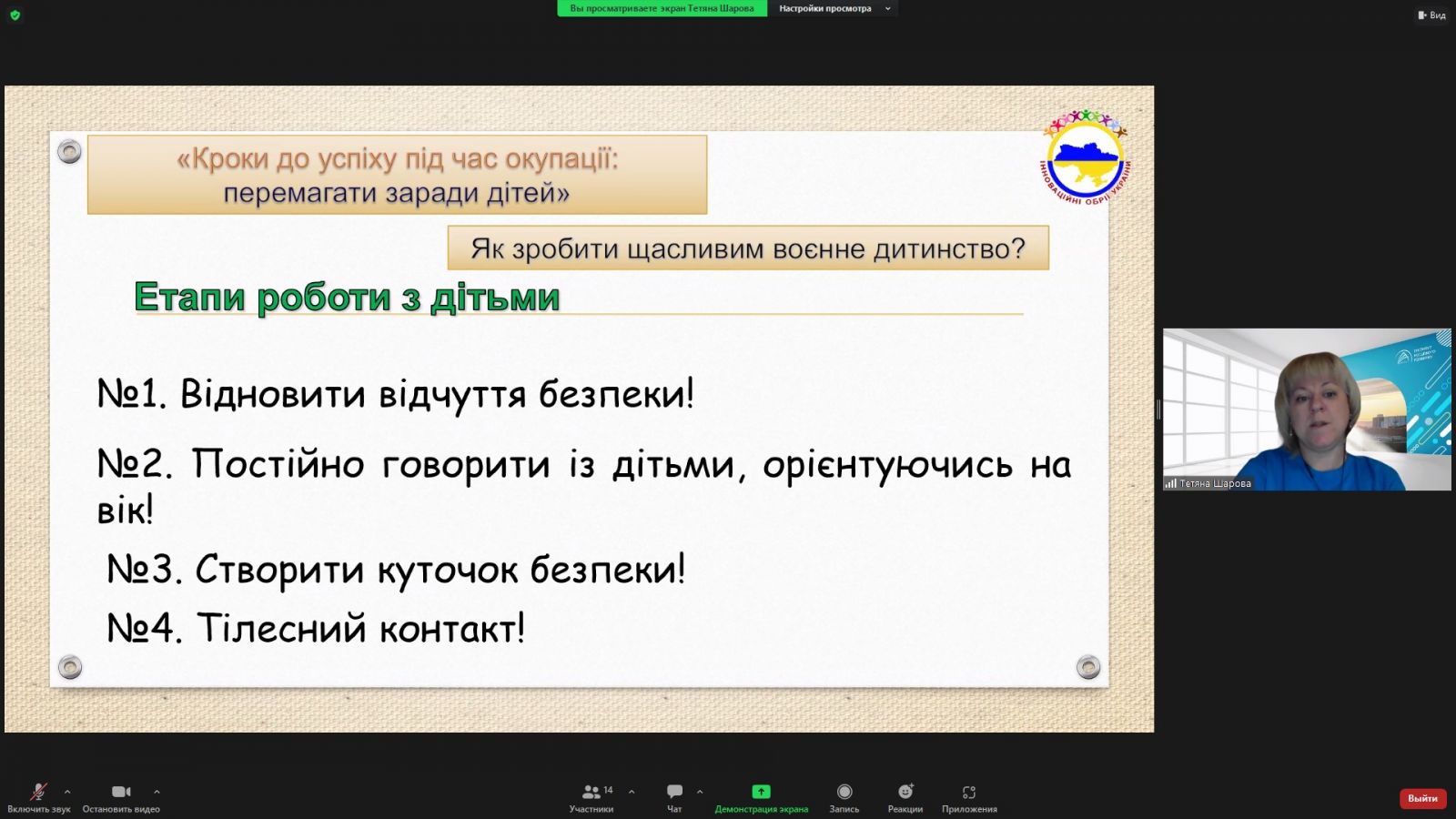 - Онлайн-тренінг «Як зробити щасливим воєнне дитинство?» (спікерка професор Тетяна ШАРОВА)