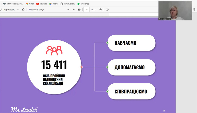 14-16 листопада 2019 р. член правління ГО «Інноваційні обрії України», завідувач кафедри української і зарубіжної літератури Мелітопольського державного педагогічного університету імені Богдана Хмельницького Шарова Т.М. взяла участь у тренінгах з використання освітньої онайн-платформи Відкритого Університету Майдану (В...